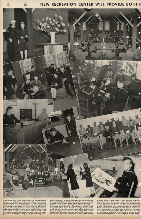 A MODERN BUILDING throughout is the new Recreati,on Picture legend-1. A scene in the hall and entrance on the of g,oing ashor-e. 5. Mrs. J-essie T . Horn, Director of Activi:~